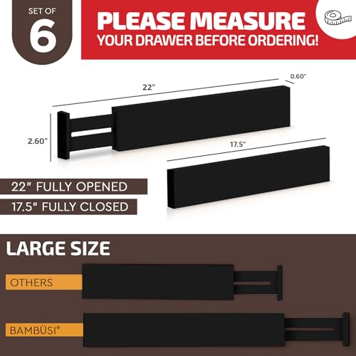 Bambüsi - Large Kitchen Drawer Organizer - Expandable Bamboo Drawer Dividers (17" - 21.5") - Adjustable Separators for Kitchen, Clothes, Dresser, Bedroom, Bathroom, and Desk Drawers - 6-Pack - Black