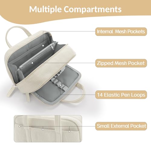 - Efficient Organization: The pencil bags features 7portions, including 3 mesh pocket, and 1 zip mesh pocket, 1 zip pocket with 14 elastic pen loops. It provides ample space to store and organize your office supplies, makeup items, sewing accessories, or electronic gadgets.