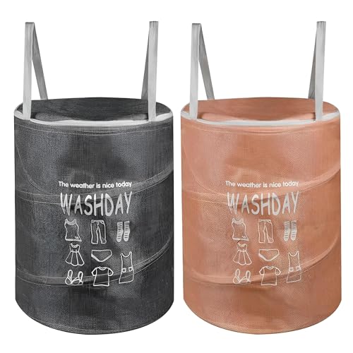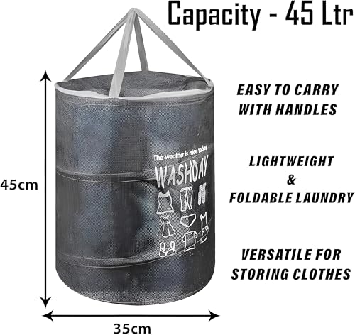 - This foldable round laundry basket with a 45-liter capacity offers a practical storage solution for clothes, toys, and household items. Made from durable jute, it has dimensions of 45 x 35 x 35 cm, making it a compact yet spacious option that blends functionality with style.