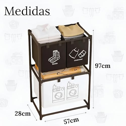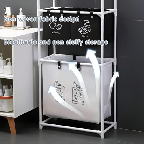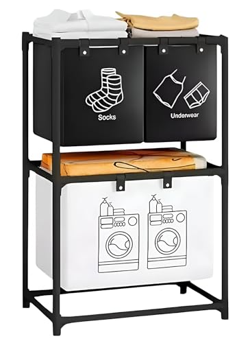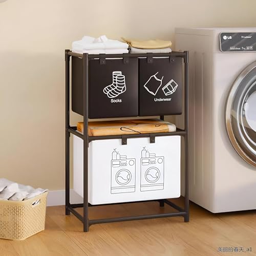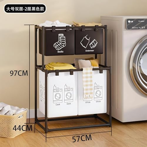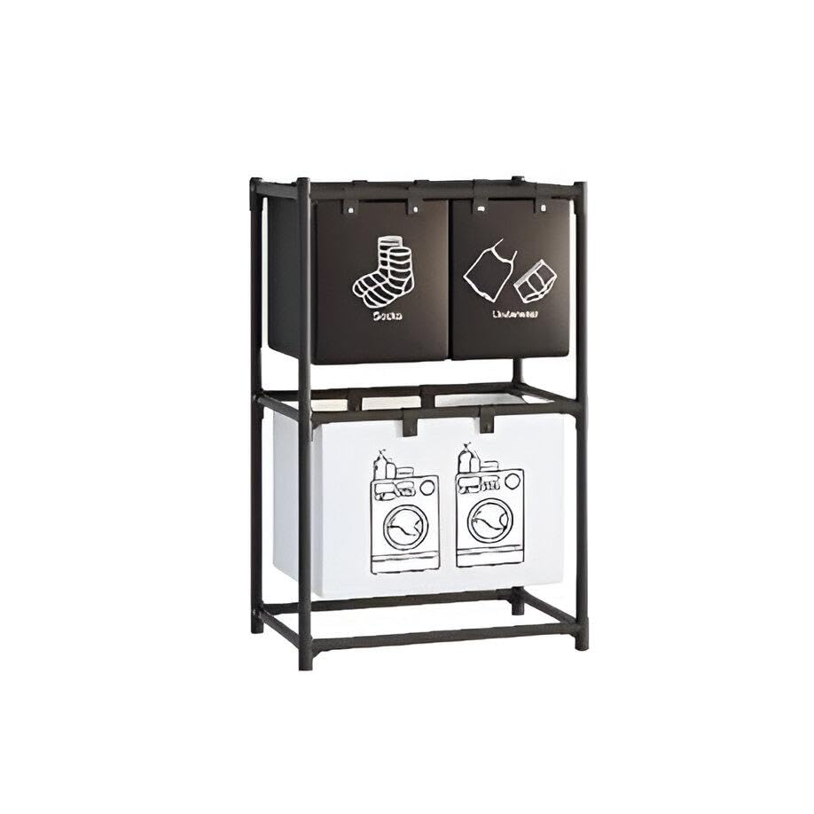 - The organiser features a robust two‑tier construction, with a 97 cm tall black metal frame that supports four removable fabric bags—two on the upper level for socks and underwear and two larger hampers on the lower level for dark and white garments—providing clear physical separation of laundry types.
