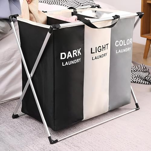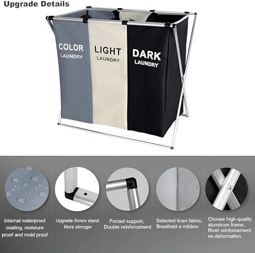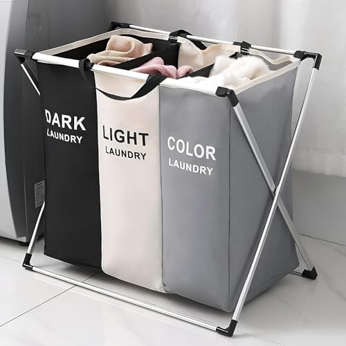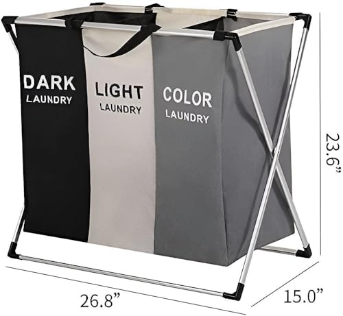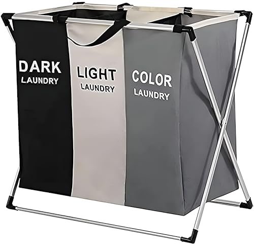 - This 3-section laundry sorter features clearly labelled compartments for dark, light, and colour laundry, enabling efficient sorting as you collect clothes—reducing pre-wash preparation time and preventing colour bleeding.