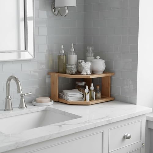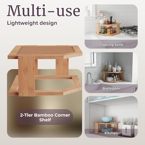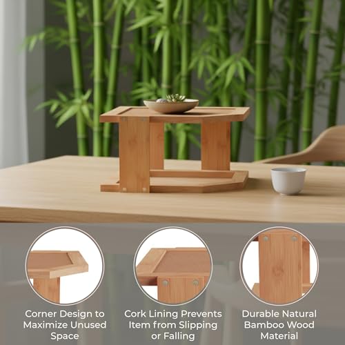 - BAMBOO CONSTRUCTION - This 2-Tier corner shelf is not only a space saving organizer that compliments your home decor, it’s also constructed from sturdy bamboo.