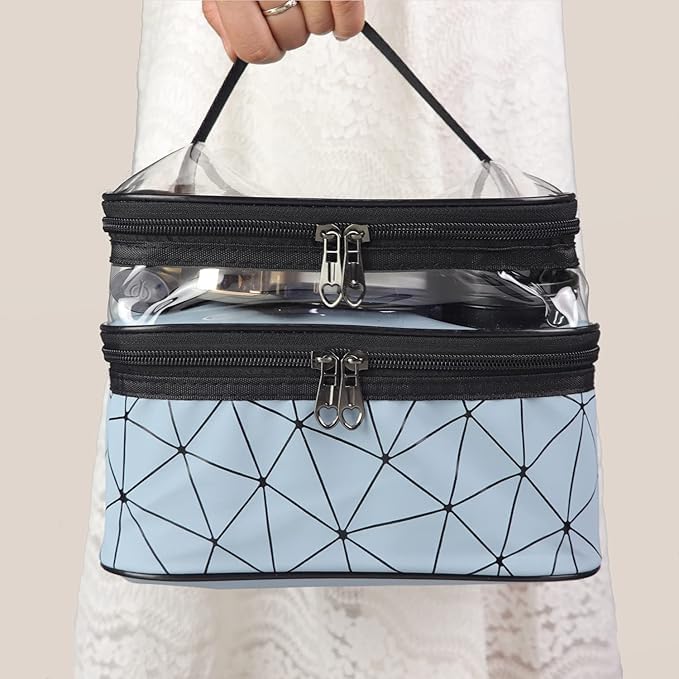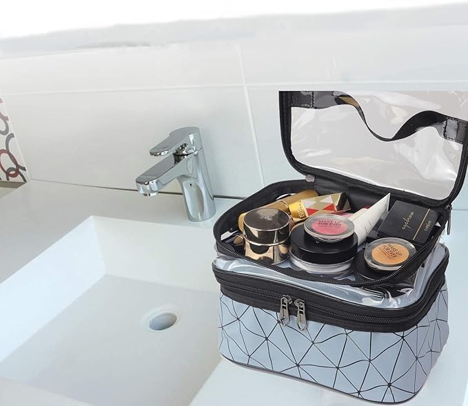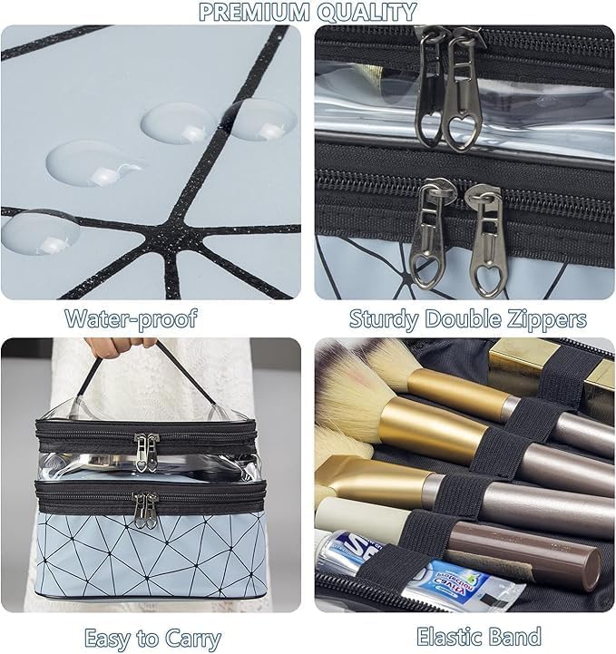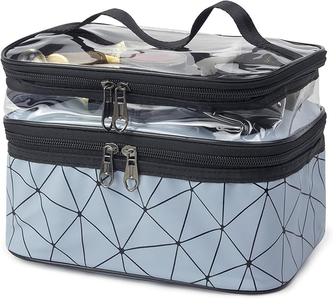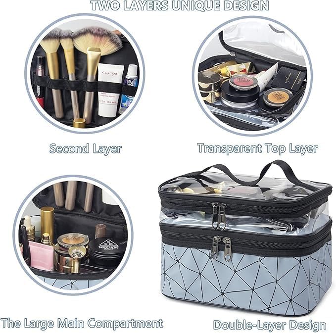 - Double-Layer Design: This makeup bag has 2 layers, large capacity can easily throw in full-sized cosmetics or toiletries. The top layer is transparent and water-resistant which can ensure dry wet depart, the large main compartment for storing your makeup and full-sized skincare products. The layered design that makes it easy for you to sort and store.