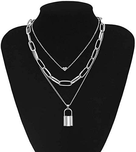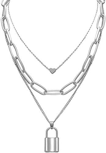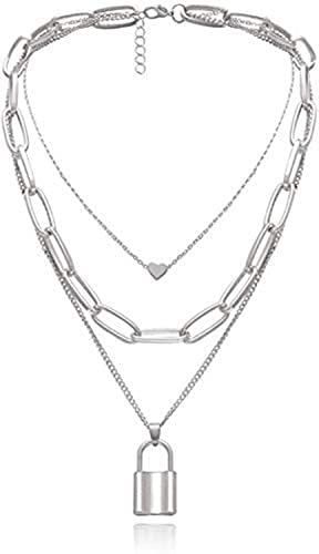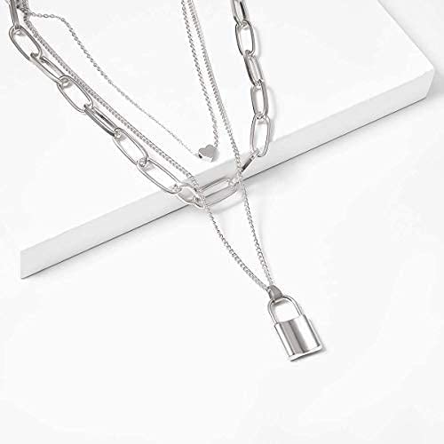 Generic - Layered Necklace Punk Jewelry Lock and Key Long Chain Necklaces for Women Men Teen Girls (Silver)