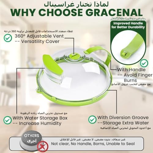 - يمنع الطعام من الجفاف: غطاء طعام للميكروويف بتصميم مطور مع صندوق تخزين مياه، حيث يتم إضافة الماء قبل الاستخدام ويمكن أن يزيد من الرطوبة ويساعد في الحفاظ على رطوبة الطعام ومذاقه. غطاء طبق ميكروويف طويل بتصميم قبة يمنع ملامسة الأطعمة، فهو مثالي بدلًا من الغلاف اللاصق. بالإضافة إلى ذلك، فإن الغطاء الخاص بنا مزود بأخدود تحويل لتخزين مياه البخار الإضافية، لذلك لا داعي للقلق بشأن بقع الماء. يرجى تدوير فتحة التهوية الخضراء القابلة للتعديل بزاوية 360 درجة إلى حالة العادم عند التسخين.