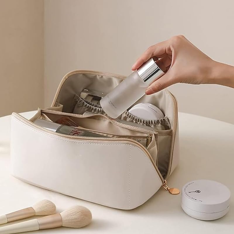 Generic - شنطة تخزين جلدية محمولة مقسمة بسعة كبيرة ومقبض قوي عملي لادوات الزينة للبنات - ابيض