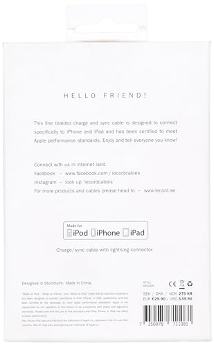 - Brand: LecordType: CablesCompatible With: MultiColor: Multi ColorEAN-13: 7350078711081Length: 1 MeterDetails: This cords are thin and wrapped in knitted fabric for the best combination of design, feel. Compatible with all iPhone Mobiles.