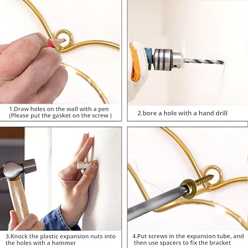 - التركيب بسيط بشكل ملحوظ: فقط قم بمحاذاة البراغي المعدنية الذهبية المرفقة بالتوازي مع بعضها البعض من خلال الثقوب المثقوبة مسبقًا، مما يضمن تثبيتًا آمنًا وخاليًا من الأدوات يحافظ على سلامة الجدار ولا يتطلب أي مساعدة احترافية.