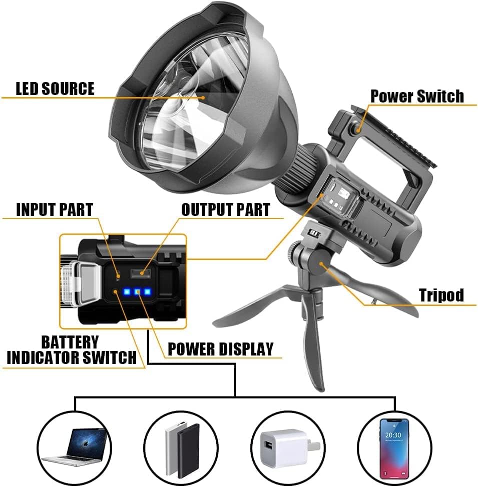 - Super Bright Large Spotlight:Super Bright 90000 Lumen large Spotlight, built-in advanced XHP70 LED chip,powerful long range lights, the light distance can up to 800m.It can be used as a long-range tactical flashlight.