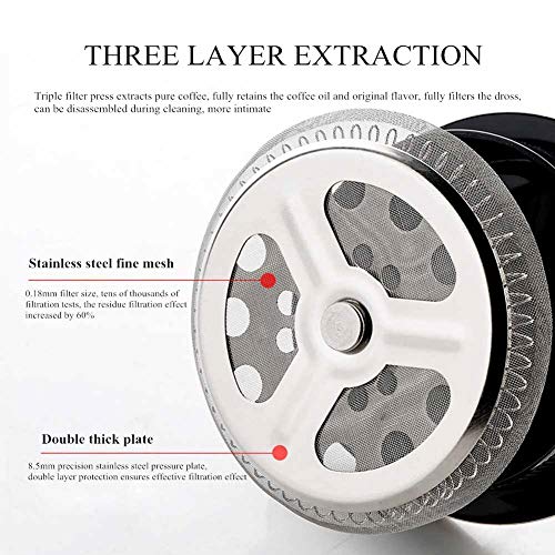- 3-LAYERED STAINLESS STEEL FILTER STRUCTURE: traps the smallest coffee grounds to produce an exceptional full-bodied flavor.