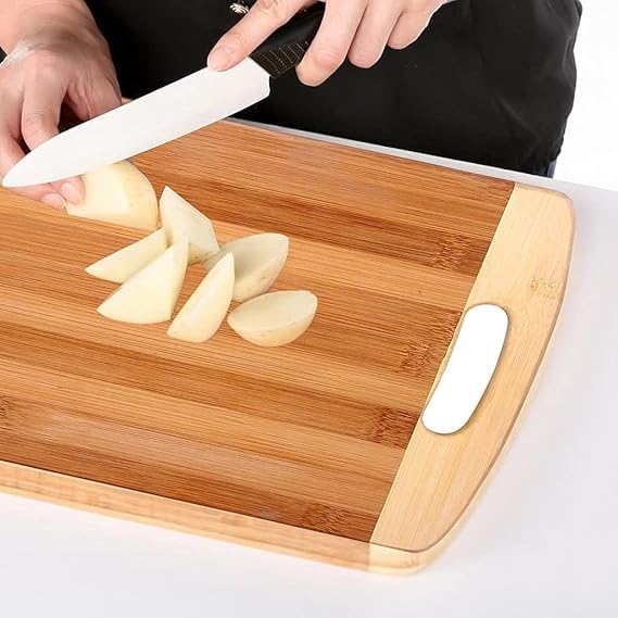 - 𝐃𝐮𝐫𝐚𝐛𝐥𝐞 & 𝐄𝐚𝐬𝐲 𝐓𝐨 𝐂𝐥𝐞𝐚𝐧: Thick Bamboo that can withstand heavy blows, chopping and soaking, would not warp or split, and is more durable than most brand cutting board whose material is wood. Clean with mild soap and water; dry thoroughly. Do not submerge in water to extend life of the boards.