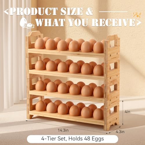 - 4 Tier Large Capacity Design: this bamboo egg holder features 14.3" x 4.3" x 4", with 12 rounded slots per tier. A complete set of 4 racks holds up to 48 eggs, perfect for farm-fresh egg storage or family kitchens