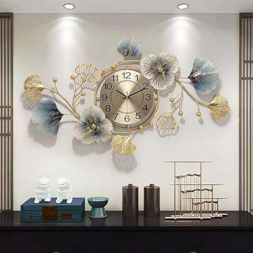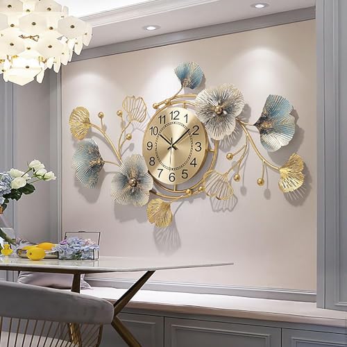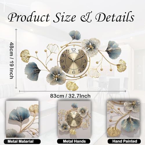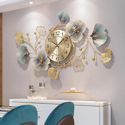 Lenikf - ساعة حائط معدنية عصرية صامتة بدون تكتكة ، ساعات بتصميم اوراق الجنكة لتزيين المنزل وغرفة المعيشة فنية جدارية يدوية الصنع مقاس 33 × 19 انش ذهبي تناظري