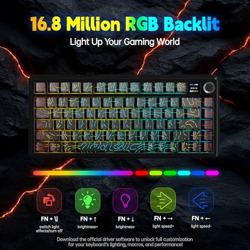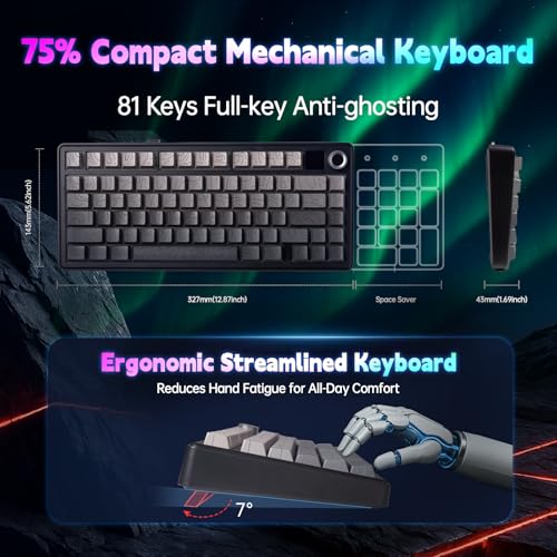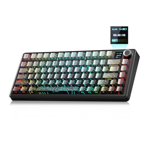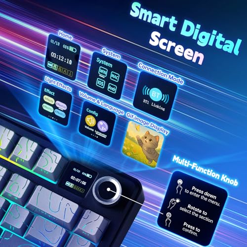 - F75 MAX Mechanical Keyboard - Smart Control Meets Personalized Flair: Glance effortlessly at the vibrant Smart TFT Display to track real-time battery levels, connection/system status and date/time. Transform the screen into your creative canvas by uploading custom animated GIFs to infuse personality into your workspace/gaming. The aluminum alloy knob delivers precision control— easy and fast to adjust RGB lighting effects/speed/brightness, system volume and more