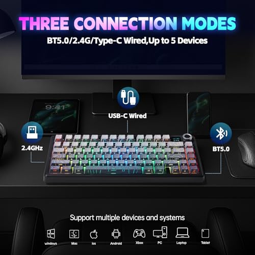 - Tri-Mode Wireless Mechanical Keyboard: Seamlessly switch between Bluetooth (3 devices), ultra-responsive 2.4GHz wireless, and USB-C wired modes. Cross-platform compatibility with WIN XP/7/8/10, MAC/Android/iOS lets you control PCs, tablets, and phones simultaneously. Swap devices instantly via key combinations