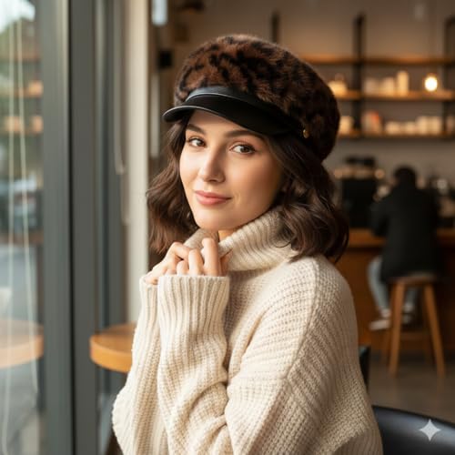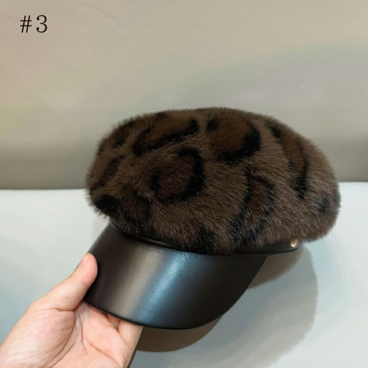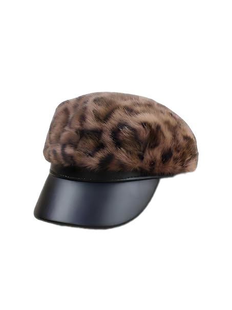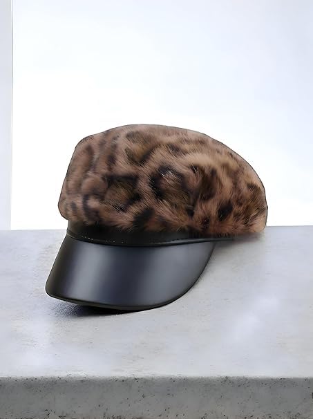 Generic - قبعة كاب فرو بنمط جلد الفهد مع حافة جلدية سوداء، قبعة شتوية عصرية للنساء تناسب جميع الاعمار ولمختلف المناسبات