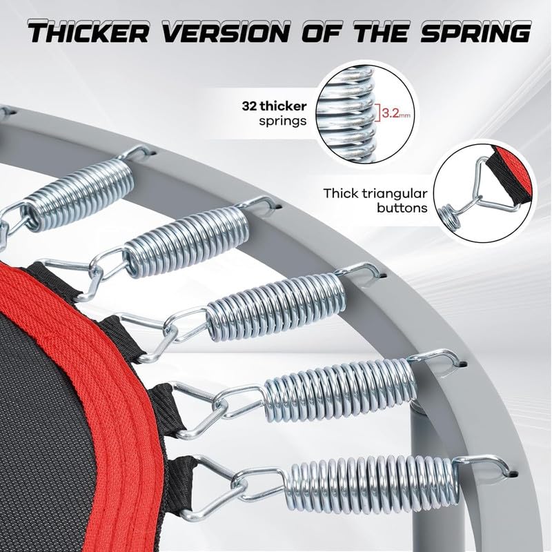 - بساط قفز عالي المرونة: يتم توصيل بساط القفز بالحافة المستديرة بنوابض متعددة مما يوفر دعمًا قويًا لبساط القفز والترامبولين بأكمله. مصنوعة من مادة البولي بروبيلين عالية المرونة وهي واسعة ومسطحة.