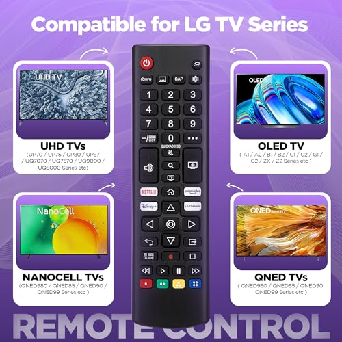 - 📺 Full LG Compatibility – This replacment LG remote control for TV works with all major LG TVs including OLED, UHD, NanoCell, and Smart series. Compatible with lg tv remote, lg tv remote control, lg remote, and lg remote control for tv. Supports all major LG Smart TVs including OLED Series (e.g. G1, C1, B2, C2), NanoCell (e.g. NANO75, NANO85, SM90), UHD (e.g. UN73, UN85, UP75), and QNED (e.g. QNED80, QNED90). Ideal for 4K, 8K, Full HD, LCD, LED, and MiniLED TVs as LG TV remote controls.