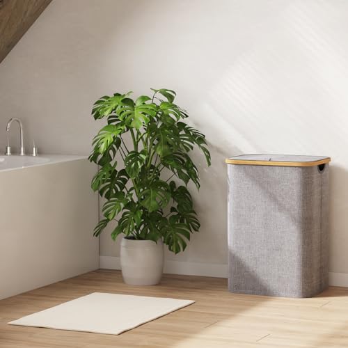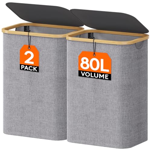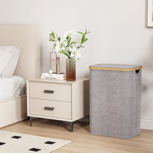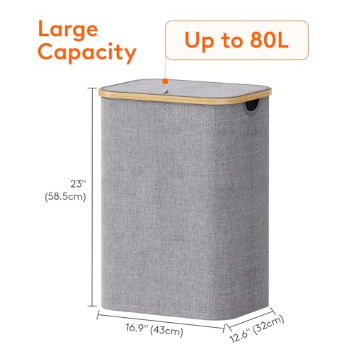 Lifewit - Lifewit 80L Laundry Basket with Lid, Clothes Hampers for Laundry with Bamboo Handles and 2 Removable Laundry Bags, Large Foldable Laundry Hamper for Bedroom, Bathroom, Dorm, Laundry Room, Light Gray