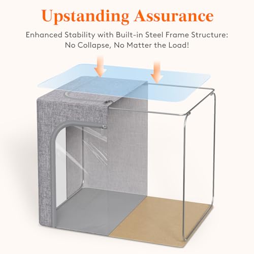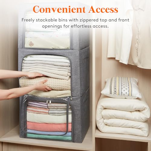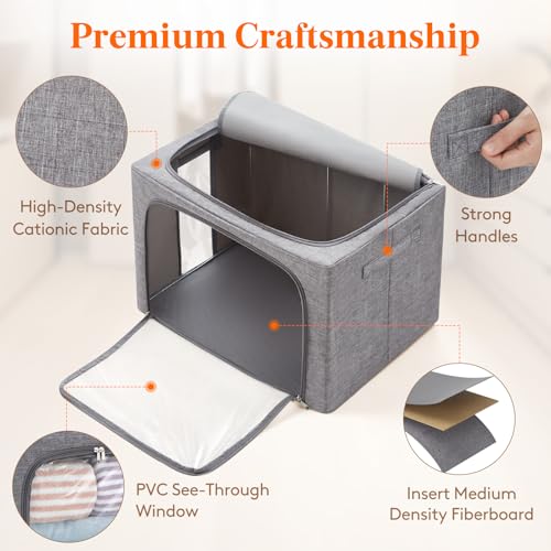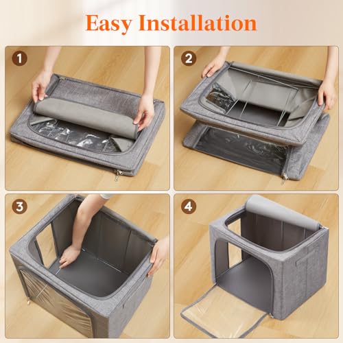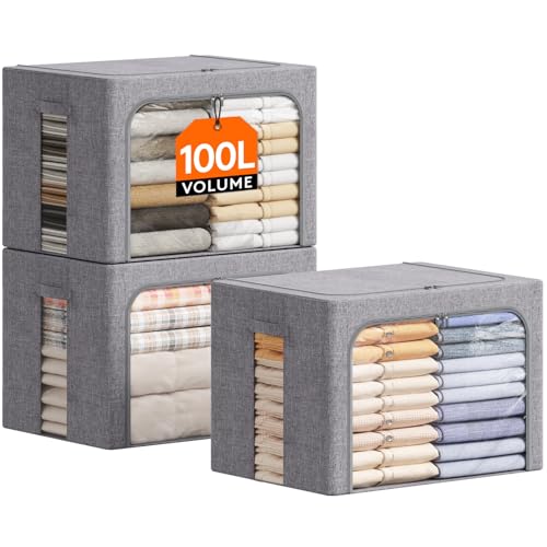 Lifewit - لايفويت صناديق تخزين الملابس مع اطار معدني، صندوق تخزين قابل للتكديس، صناديق تخزين ملابس قابلة للطي مع اغطية، اكياس تخزين 100 لتر، منظم صندوق قماشي مع نافذة شفافة وسحابات ومقابض متينة، 3 عبوات