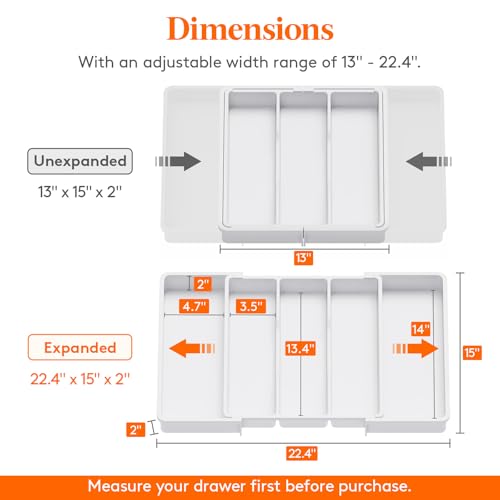 - Expandable and Adjustable: The expandable utensil organizer adjusts from 3 to 5 slots. Folded: 13"×15"×2"; expanded: 22.4"×15"×2". Stores utensils and silverware neatly. Note: Measure your drawer first before purchase