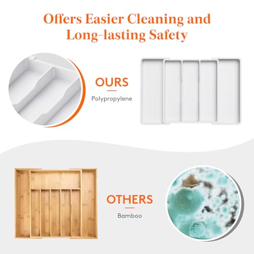 - Safe to Use: Crafted from BPA-free PP material, this cutlery drawer organizer guarantees the safety of all your utensils, silverware, and flatware. Cleaning is a breeze as well - simply rinse with water to remove stains.