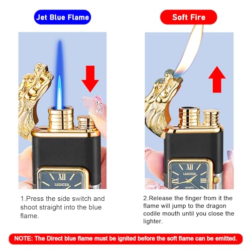 - 🔥【Dragon Torch Lighter】 Upon pressing the ignition button, the flame springs to life, dancing into the dragon's mouth until the lighter is closed, offering two mesmerizing flame modes - a wind-proof blue jet fire and an soft flame.
