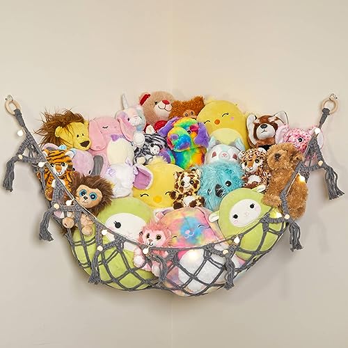 - 🧸 HAVE A BIG STUFFED ANIMAL COLLECTION? Not to worry! Keep them organized and out of the way by hanging them in a corner of your room. Also looks cute and keeps your kids company! Keep the stuffed animals, baby toys, jumbo toys, stuffed pet toys, and stuffed animals off the floor, and reclaim your space today!