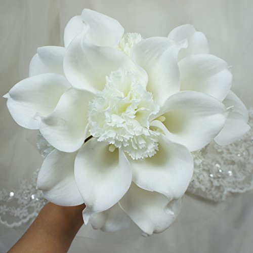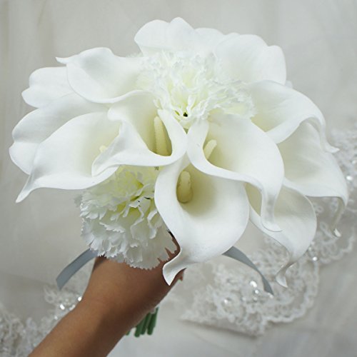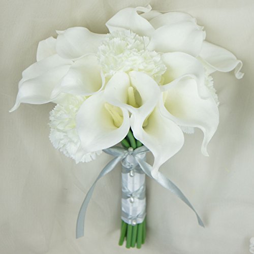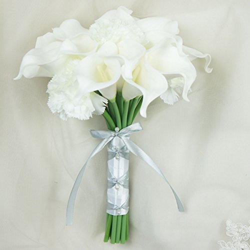 Lily Garden - Mini 15" Artificial Calla Lily 16 Stem Flower Bouquets with Ribbon (White with Carnation)
