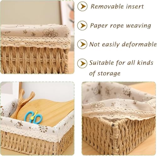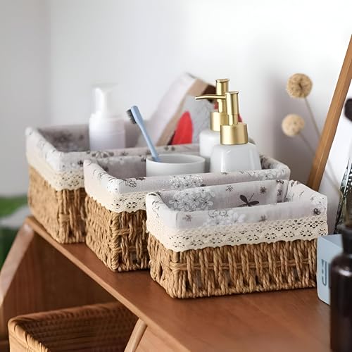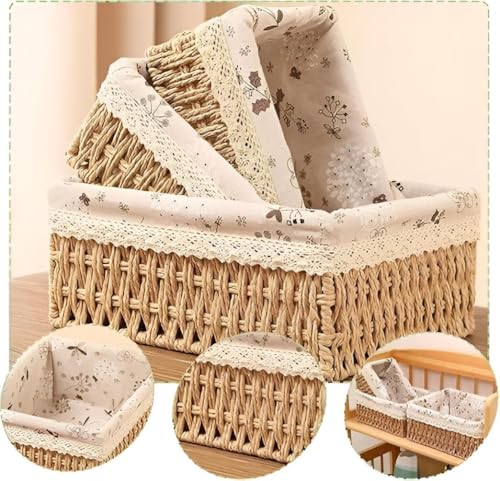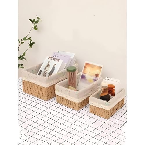Generic - سلال راتان مغطاة بالكتان - مجموعة تخزين انيقة من 3 قطع بمقاسات صغيرة ومتوسطة وكبيرة لتنظيم المجوهرات ومستحضرات التجميل والضروريات اليومية في المنزل بشكل أنيق.