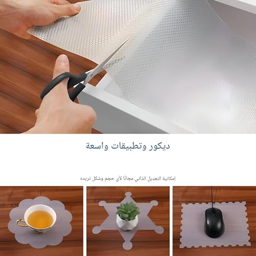 - بطانة الرف سهلة الاستخدام بشكل لا يصدق، مما يسمح بسهولة التشذيب باستخدام المقص المنزلي القياسي ليناسب قياساتك الخاصة. سواء كنت ترغب في وضع الدرج بالكامل أو ببساطة قسم، فإن التخصيص واضح، مما يتيح ملاءمة مثالية لأي درج أو رف.