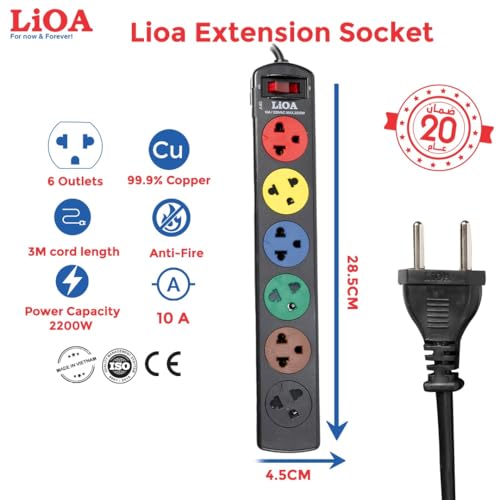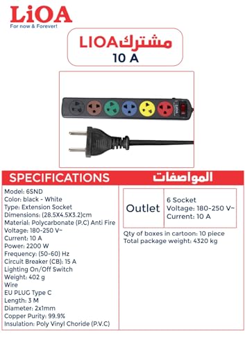 - Brand: LiOA Model: 6SND3.2.10 Connector Cross Section: 2x0.7mm Rating: 2200W (220VAC) – 10A Number of Ports: 6 Cord Length (EU Plug): 3M