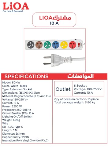 - ليوا مشترك كهربى عالمى عالي الجودة 6 مخارج ثنائي قدرة 2200 وات 10 أمبير250 فولت مع كابل 3 متر مما يجعلة الأنسب للاستخدام مع جميع أنواع الفيش ومع جميع الاجهزة صناعة فيتنامي اطول فترة ضمان 20 سنوات ضد عيوب الصناعة موصـلات نحاسـية100% مـزودة بدعامـات مـن الفـولاذ لتثبيــت الفيشــة ومنـع اهتزازهـا سـدادات امـان ضـد عبـث الاطفـال بكل عيون المشترك الكهربية قوة تحمل لدرجات الحرارة حتى 100 درجه مؤيه ضد الانفجار Circuit Breaker يفصل بشكل تلقائي عند زيادة الأحمال عن الحد المسموح بي مزود بمفتاح فتح/غلق بلمبة إشعار قابل للتعليق باستخدام أحزمة ربط بلاستيكية أو براغي ملامسات نحاسية ، مزودة بدعامات فولاذية لمنع ارتخاء المقابس