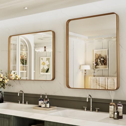 LOAAO - مراية حمام 61 × 91 سم مع إطار معدني ملون بنمط قشرة الخشب بتصميم مستدير ومستطيل ومضادة للصدأ تعلق أفقيًا أو رأسيًا من لواو