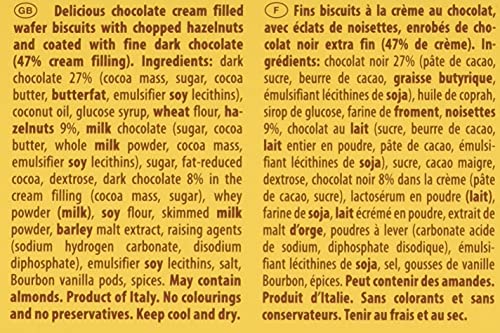 - DARK HAZELNUT: These bitter sweet, sensuous biscuits are thin wafers, smooth chocolate cream, roasted hazelnut pieces and an exquisite coat of the finest dark chocolate