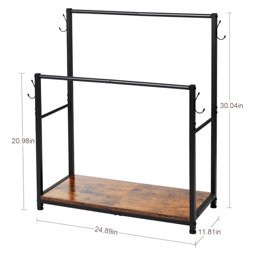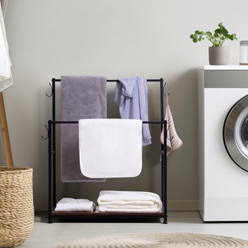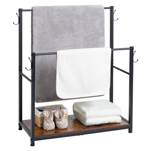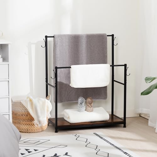 LOAKEKEL - Towel Rack, 2 Tier Blanket Rack, Bathroom Towel Rack with 4 Hooks for Small Spaces, 24.89" Length, Blanket Holder with Shelf for Bedroom, Rustic Brown, HTR022BR