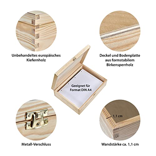 - Details – with their outer dimensions of approx. 34 x 25 x 10.6 cm (L x W x H) and inner dimensions of approx. 31.8 x 22.7 x 7.7 cm (L x W x H), the box with lid is an ideal size and is perfect for storing documents up to DIN A4. The wooden box is made from untreated pine wood, the lid and base plate are made of dimensionally stable birch plywood. Made in Poland.