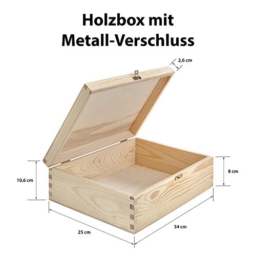 LOCALIS - Wooden Box with Lid, Metal Closure, Approx. 34 x 25 x 10.6 cm (L x W x H) - Pine Wood - Wooden Box, Memory Box, Photo Box, Gift Box, Treasure Chest, Storage Box Wood