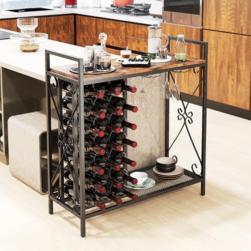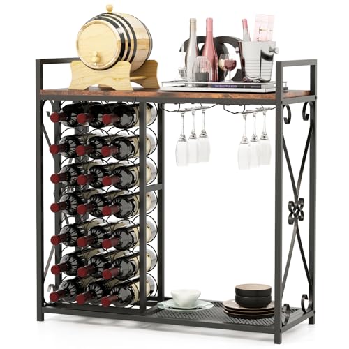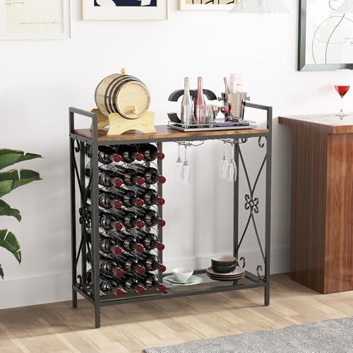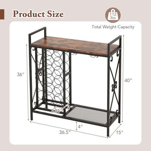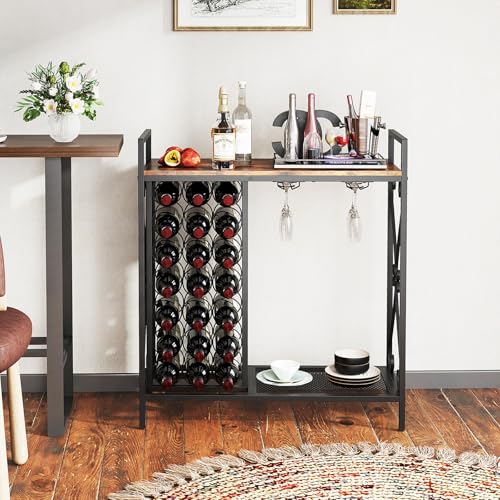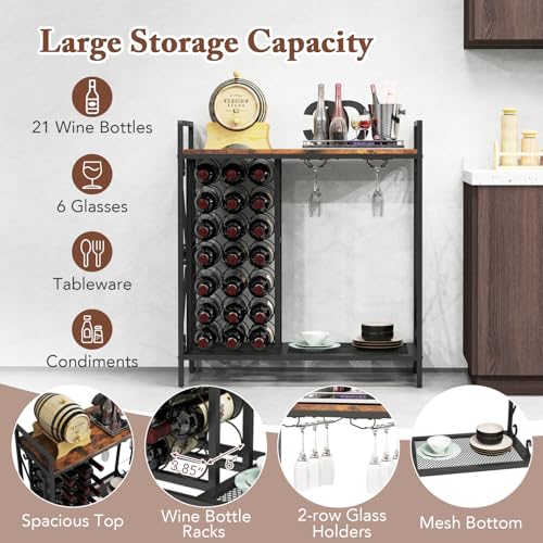 LOKO - LOKO 21-Bottle Wine Rack, Wooden Wine Bar Table with 6-Glass Wine Glass Holder, Freestanding Floor Wine Rack with Sturdy Metal Frame, Industrial Liquor Stand for Kitchen, Dining Room (Rustic Brown)