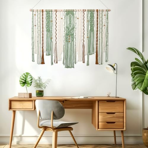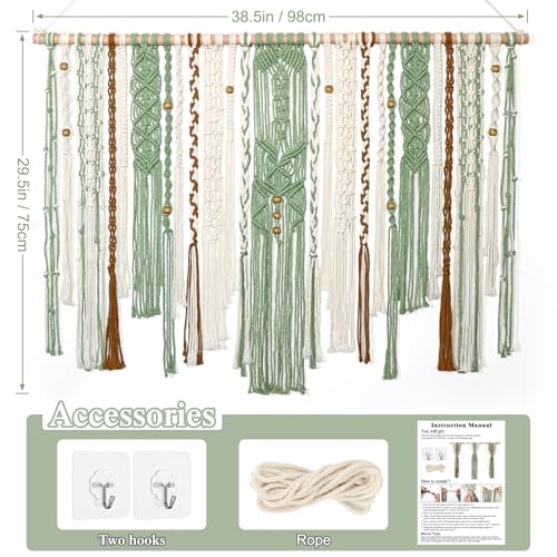 - 【HIGH QUALITY MATERIALS】This green macrame wall tapestry is hand-woven with cotton threads and high-quality solid wood rods. This package contains 3 pieces of the wall tapestry, 2 hooks and a piece of rope. Our beautiful decorative boho wall tapestry is woven carefully and with great attention to detail. Provide your home or office with a unique artistic atmosphere and improve the quality of life.
