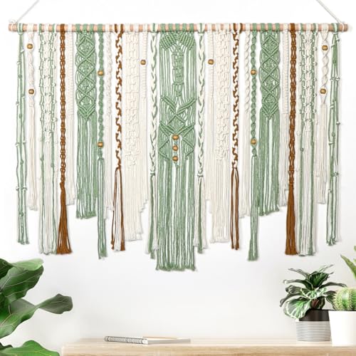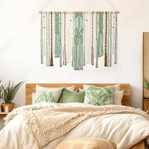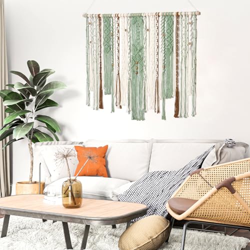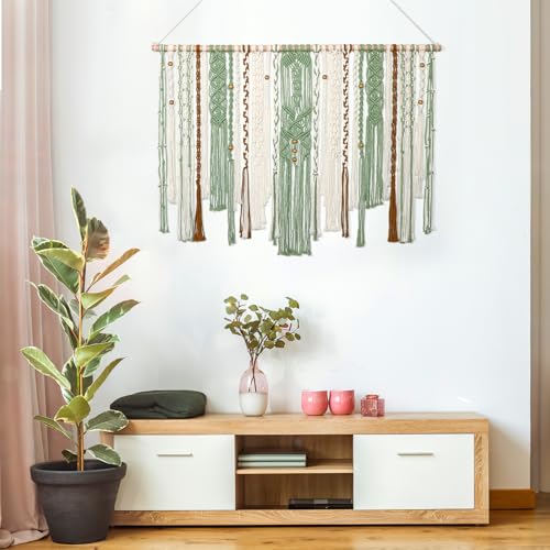 - 「UNIQUE DESIGN」The unique design and style of green macrame wall tapestry are novel and match colors well. The accent of the wooden beads gives the bedroom wall decor an elegant and vintage effect. It's a different kind of bohemian style. It brings a different feeling and interest to the aesthetic wall you want to decorate.
