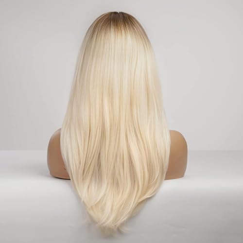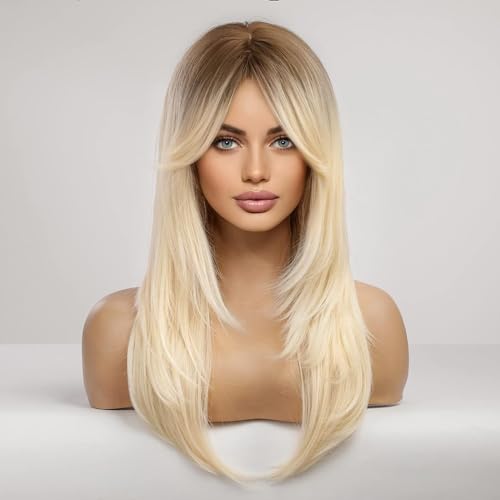 Generic - Long Blonde Wigs for Women Ombre Synthetic Hair Wigs with Bangs Black Roots