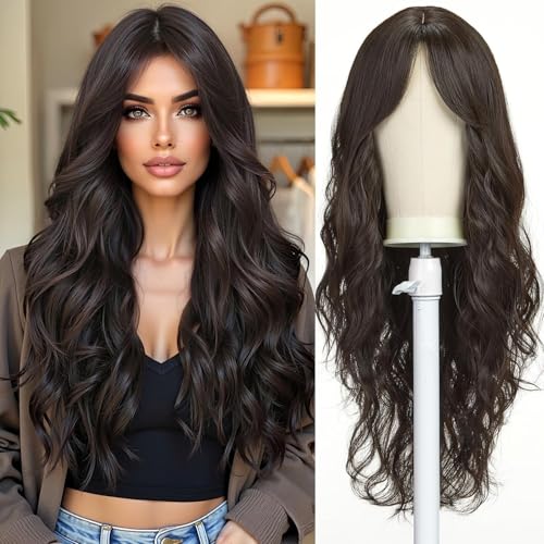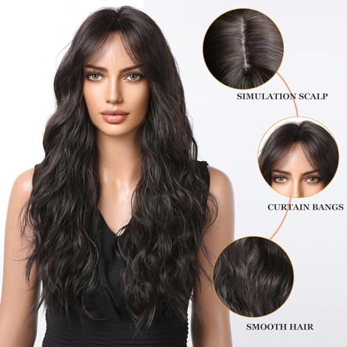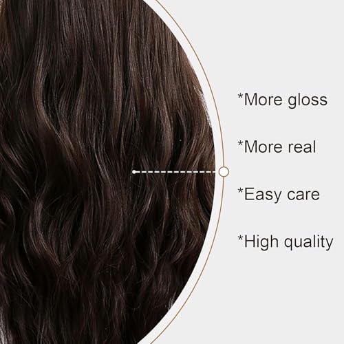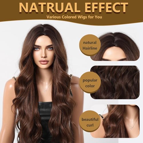 Generic - LONG Body Wave Wig Shoulder Length Synthetic Wig with Bangs 150% Density Ocean Heat Resistant Synthetic Fiber Curly WAVEY Hair22 INCH -60 cm to 65 cm-JW72-8 -MEDIUM BROWN