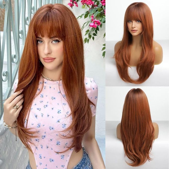 Generic - Long Reddish Brown Wig with Bangs Natural Wavy Wigs for Women