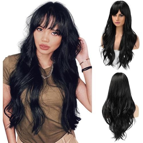 Generic - باروكة سوداء طويلة ومموجة بغره اماميه من شعر صناعي طويل