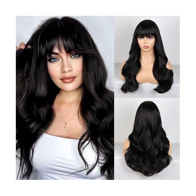 Generic - Long Wavy Wig with Bangs Black Synthetic Hair Natural Looking
