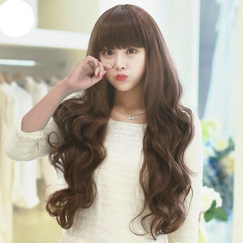 Generic - باروكة شعر طويل مموج بغرة، بني، شعر مستعار صناعي، طول كامل، أسلوب كوري