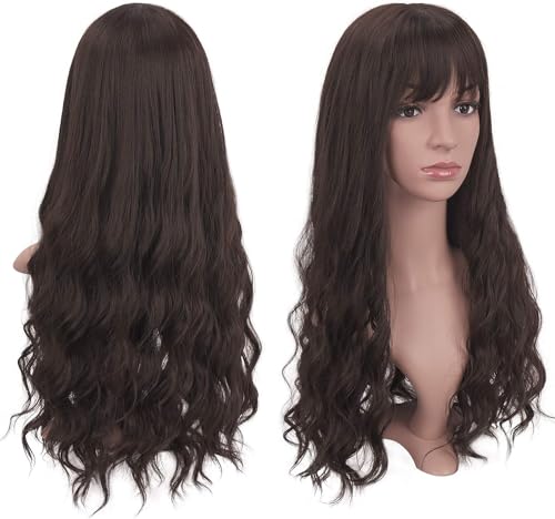 Generic - Long Wavy Wig with Bangs Synthetic Wigs for Women Heat Resistant Brown Wig