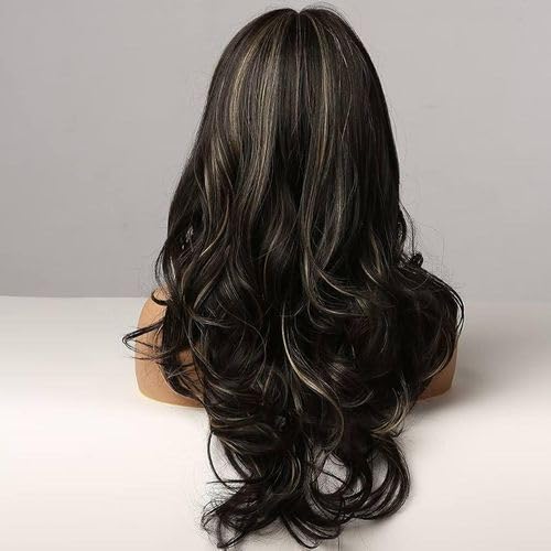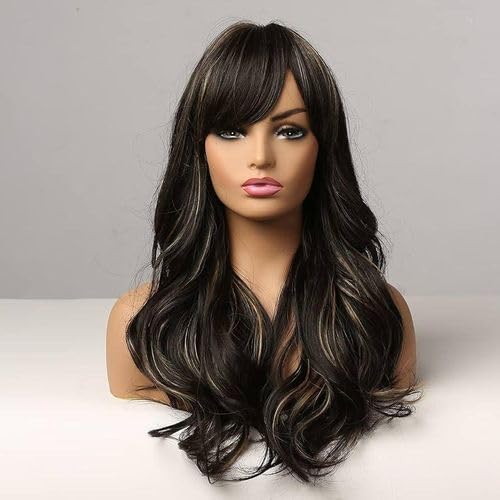 Generic - Long Wavy Wig with Side Bangs Synthetic Black with Brown Highlights Full Length