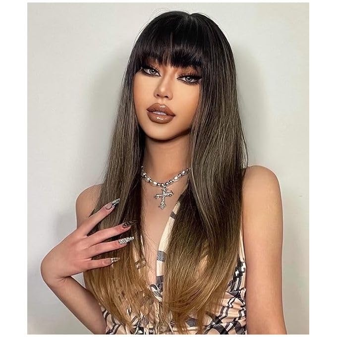 Generic - باروكة شعر مستعار طويل بغرة، أومبري من الأسود إلى البني إلى الأشقر، شعر مستقيم